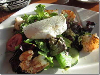 I was in the mood for a big salad with balsamic and olive oil. Lucky for me, they had a tri color salad with a large blob of homemade mozzarella! To beef it up a bit, I added local shrimp: